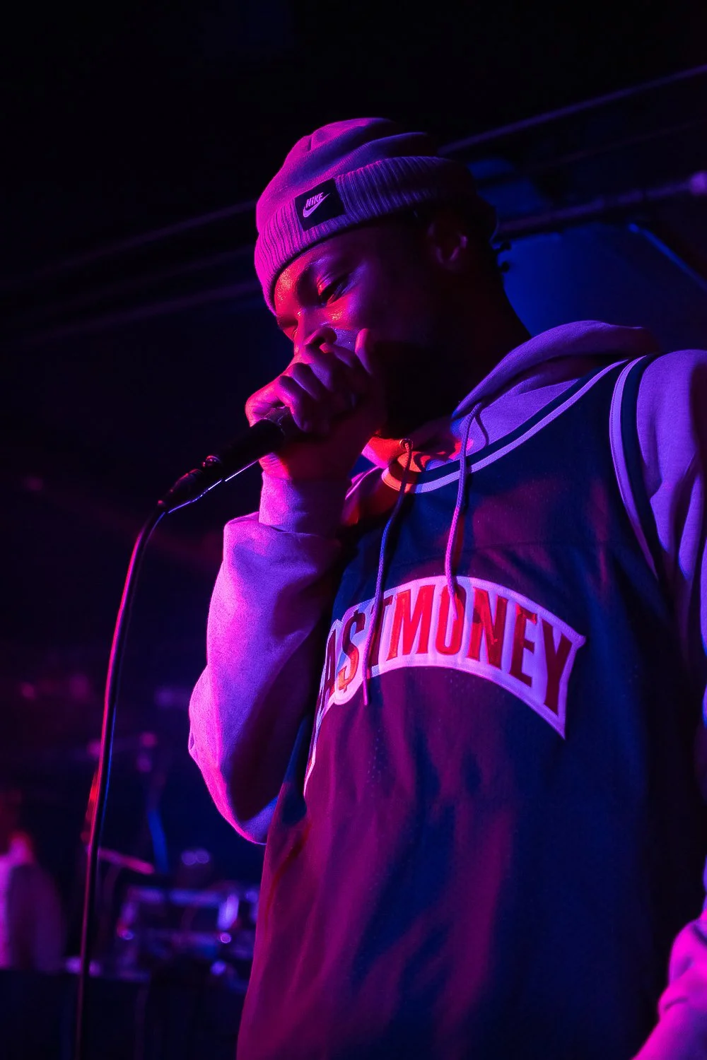 A young man in a gray Nike beanie and a colorful hoodie with 'Lost Money' written on it, holding a microphone and performing in a dimly lit venue with purple and pink lighting.